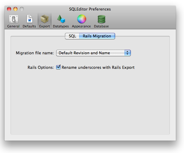 This option allows you to choose the default file name when exporting rails migrations. This is the file name that appears in the save sheet before you edit it. You always have final control over the file name of the migration.