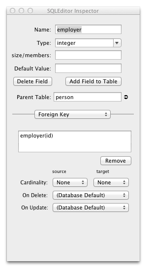 By selecting from the inspector panel popup menu, the is displayed. This allows editing of a field's foreign key settings. Not all fields have foreign keys set, so the controls may be disabled. Also if you have a set a foreign key using a , this section will also be disabled. (To edit a table level foreign key, click on the foreign key object itself within the table, not the fields that are referenced by it)