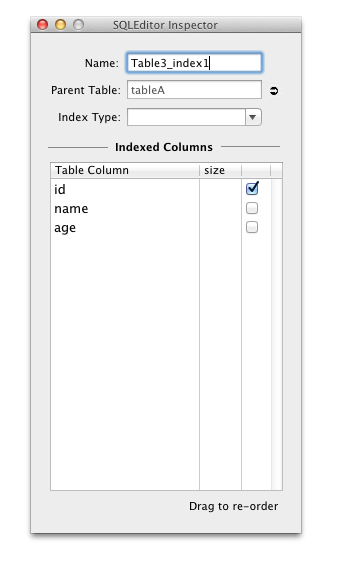 The section of the index inspector allows you to control which columns appear in the index. The table contains all of the columns found in the parent table. To include a particular column in this index, click checkbox next to the name. The entries may rearrange so that columns included in the index appear at the beginning of the list in the correct order.