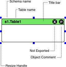 The table object represents a table in a database. Tables can have various properties that can be edited using the inspector or by direct editing Tables can be assigned to a category, which may be identified by a color. To edit a table (or any object) using direct editing hit the return key and the table name will become editable.
