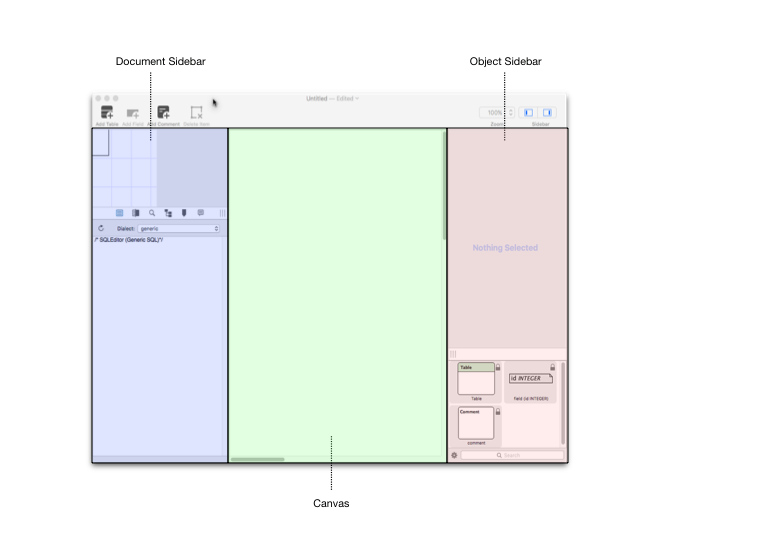 - The Canvas (green) is in the center of the main window. It shows the main diagram view.