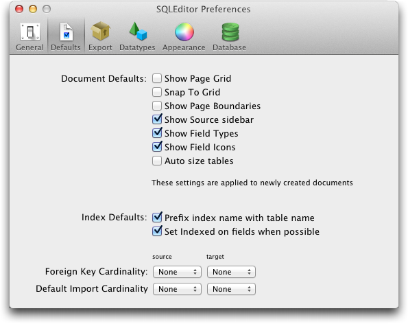 This option specifies the default cardinality settings for newly created foreign keys that are created by SQLEditor when it imports a foreign key from a database or via the SQL parser