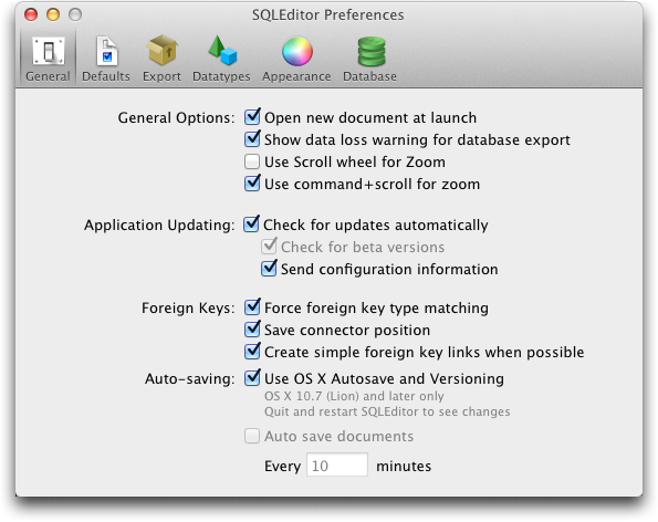 If this option is enabled then SQLEditor will autosave documents and supporting versioning in OS X 10.7/Lion and later.
