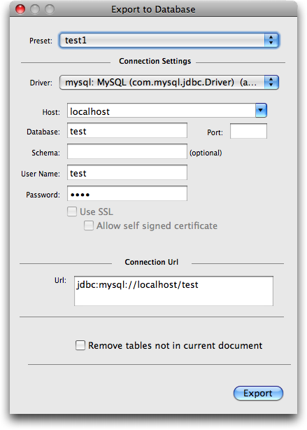 The Export panel has most of the options that the Import Panel has, except that the Table Filter field is replaced with the Remove tables not in current Document