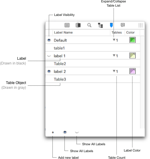 At the bottom of the window are controls to to add a new label and to hide and show all the labels in the document. To remove a label from the document, use the context/right click menu and choose . If you remove a label then all of the tables associated with it are transfered back to the default label.