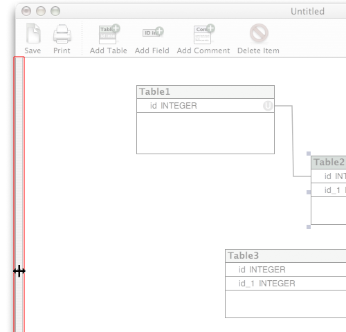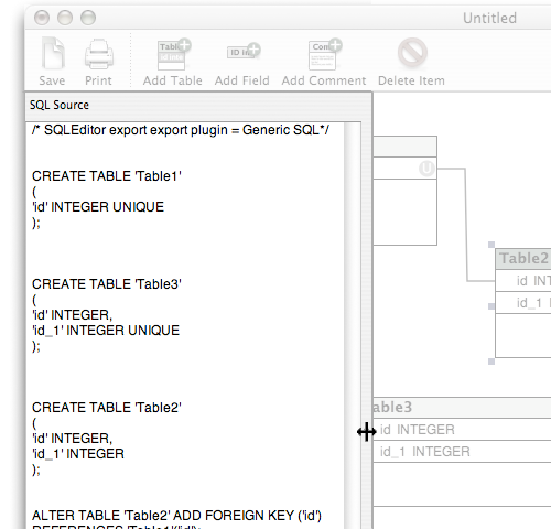 The live source sidebar displays the SQL source for the current document in a panel on the left side of the main window. As you edit your SQL schema diagram you can see instantly the changes to the SQL source.